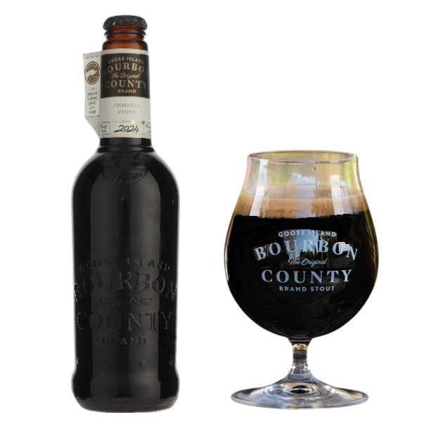 Goose Island Bourbon County Stout 2024, es una Imperial Stout de edición limitada, envejecida en barricas de Bourbon de Buffalo Trace, Heaven Hill, Four Roses y Wild Turkey durante un promedio de 12 meses.