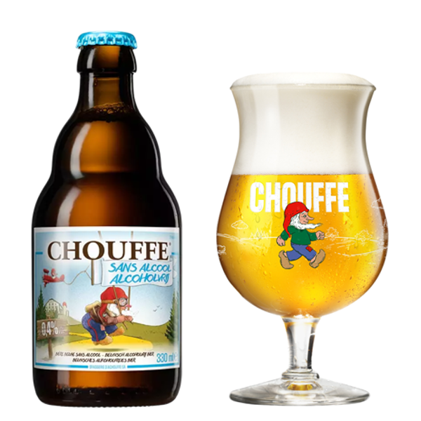 Chouffe Sin alcohol, una rubia dorada, con un sabor fresco, afrutado con toques especiados.