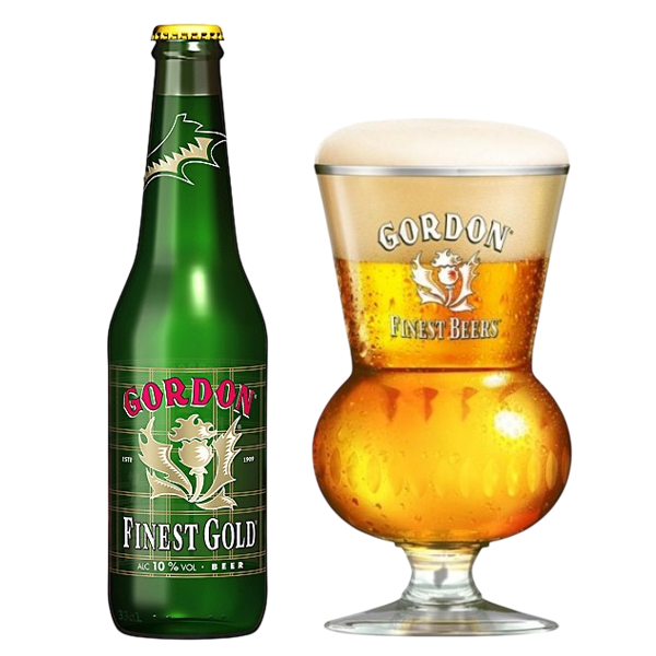 Gordon Finest Gold , cerveza de baja fermentación, elaborada desde 1991, a inspirado la fiebre del oro, cerveza lager fuerte de estilo escocés comparte los valores de su familia, el orgullo de sus orígenes, la fuerza de su sabor típico y potente y la nobleza de su refinamiento.