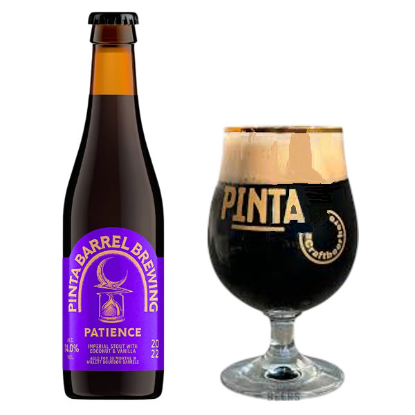 Pinta Barrel Patience 2025, es una Imperial Stout (Pastry) de Polonia, afinada 12 meses en barricas de Bourbon MGP Rye con coco crudo de Indonesia, coco tostado de Sri Lanka y vainilla en rama de Uganda, Madagascar y Vanautu
